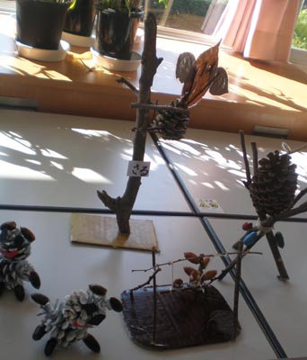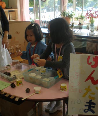 幼稚園では木の実を使って作った工作を出品し、その周りには、木の実を使って遊ぶゲームなどのお店を出店しました。