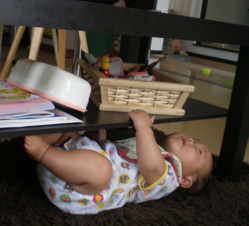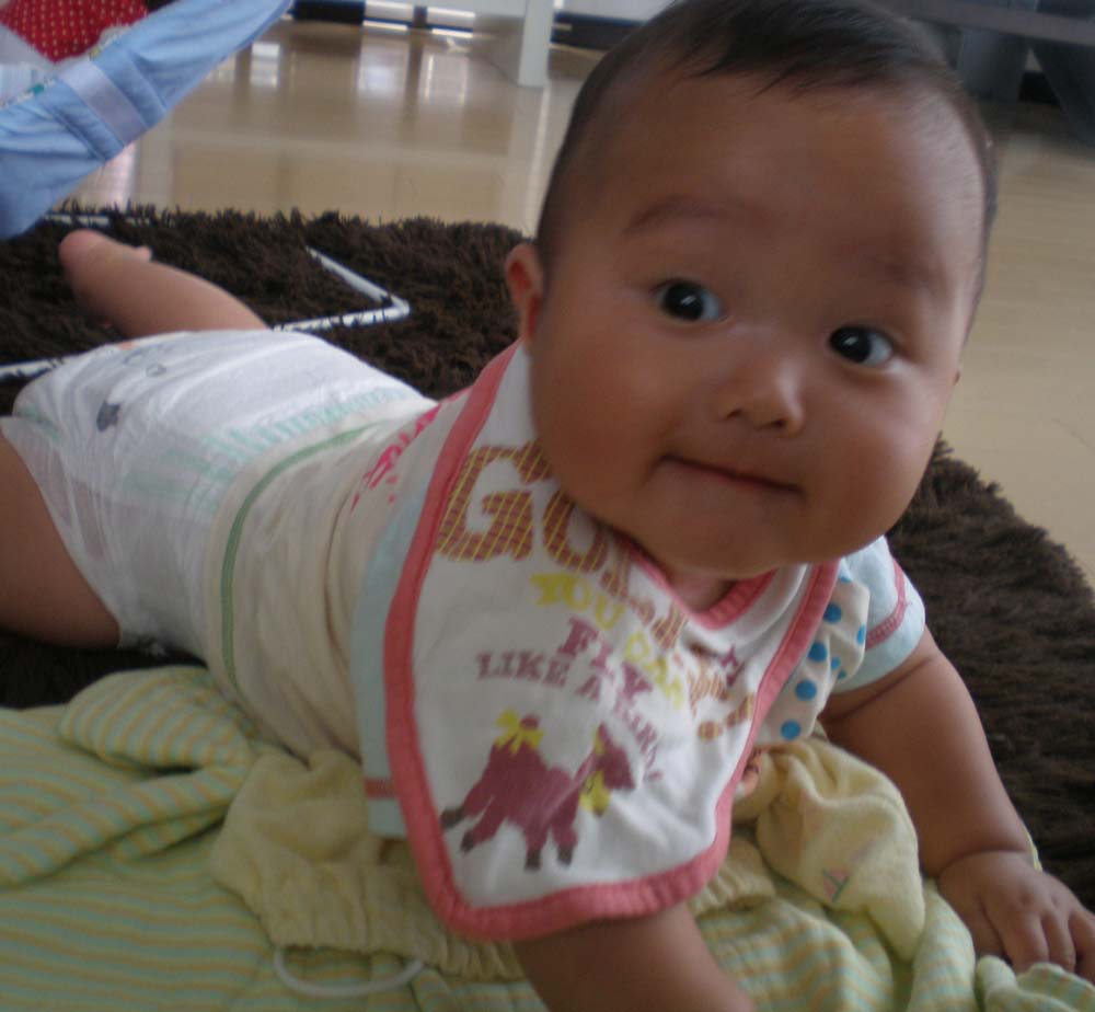 寝返りをうつようになってから、ベッドから落ちるわ、ソファから落ちるわ、、、お腹を軸にしてターンすることも覚えたので、少し目を離すとおかしな所で遊んでいます。