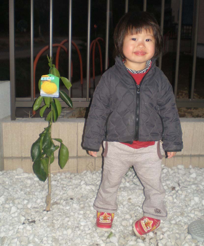 ひぃちゃんの記念樹にしようと思い、ひぃちゃんと同じ背丈のゆずの木です。