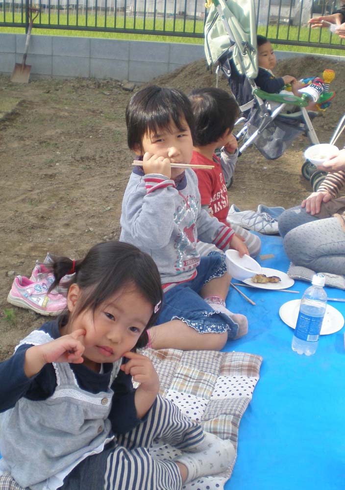 3年生の女の子から、8ヶ月の赤ちゃんまで、子供たちは6人くらいで、もちろんまとまりはなく、様々なところで遊んでましたが、ひぃちゃんたち保育園組みは、水遊びにはまっていて、新居のクロスが泥だらけになっていました・・・。