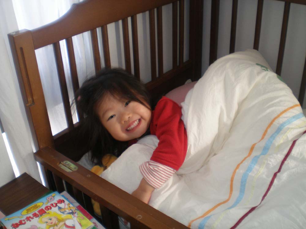 夜寝る前にそこでお父さんに絵本を読んでもらって、電気を消すと、なぜか私の隣に戻ってきます。朝起きると、また、ベビーベッドに戻ってモゾモゾしながら遊んでいます。