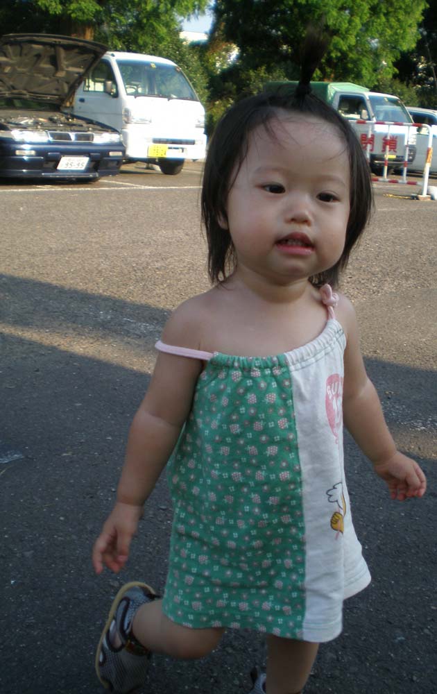 →はJAFFのお兄さんに送ってもらった駐車場でのんきに走り回るひぃちゃんと、左端っこに映る、我が家の動かなくなった車です。炎天下の中、ダンナが車の下にもぐりこんでがんばっています。