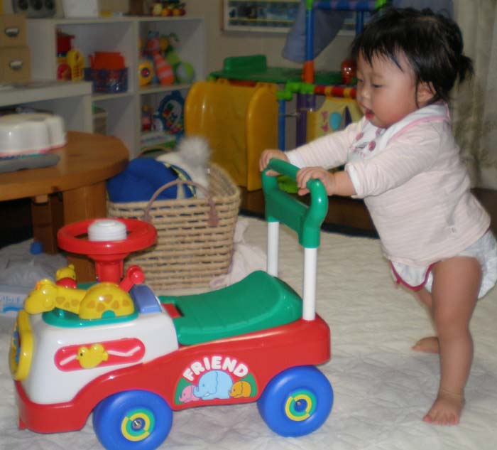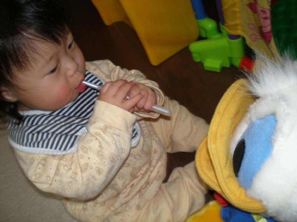 1才のひぃちゃんはちょこっと、お姉さんになりました。ドナルドのぬいぐるみを弟のようにお世話するようになりました。自分がジュースを飲んでいると、ドナルドにも飲ませたがったり、歯を磨いてあげたり、いろいろお世話したい様子・・・。いつのまにか、そんなことが出来るようになったんです。