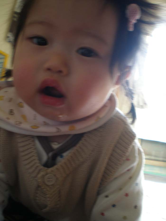 とても優しそうなおばあちゃん。ひぃちゃんはニコリともせず、始終、仏頂面で相手をじぃっと観察。抱っこされたら、やっぱり泣いた。